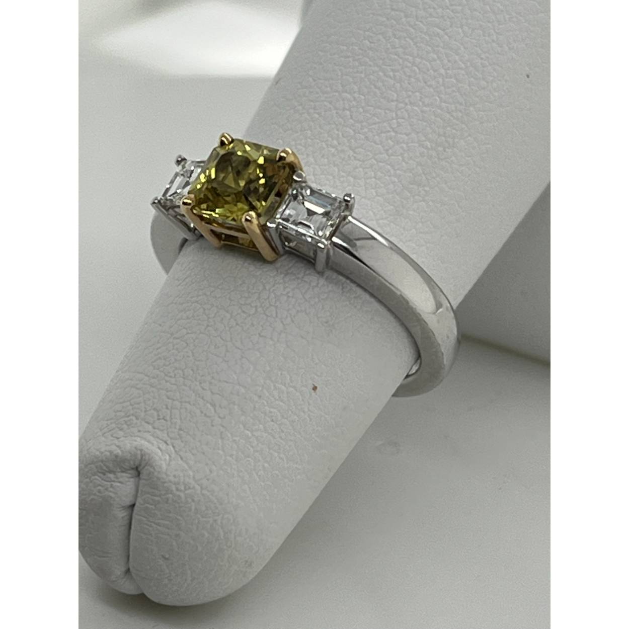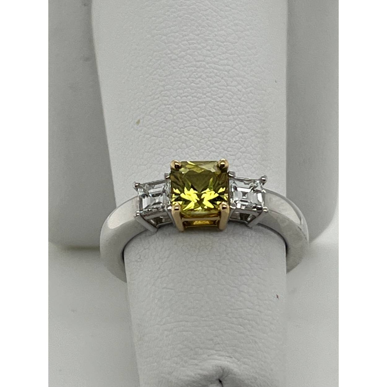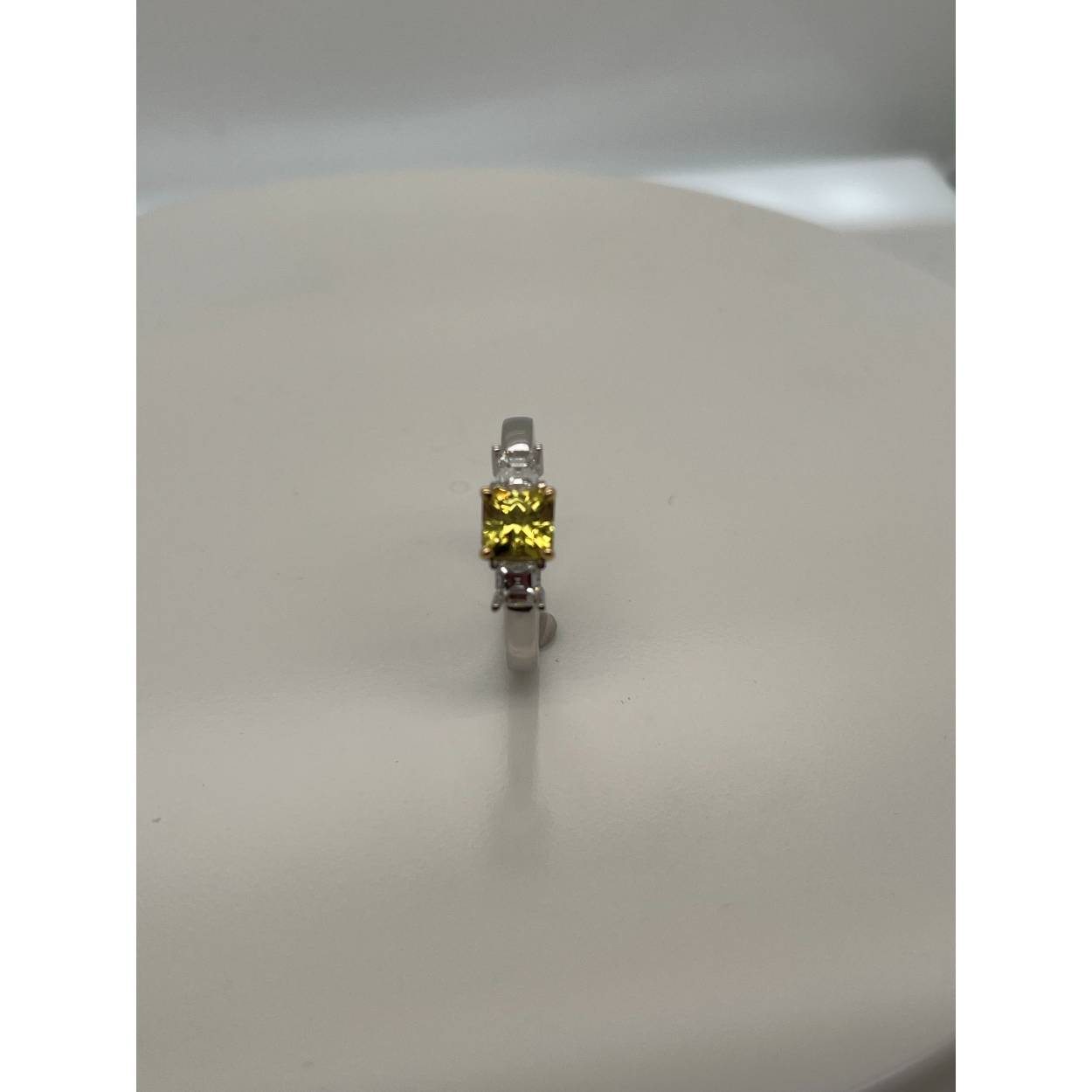18kt witgoud gezet met 2x princess geslepen diamant en een princess geslepen gele saffier, natuurlijk.  ring is handgemaakt.