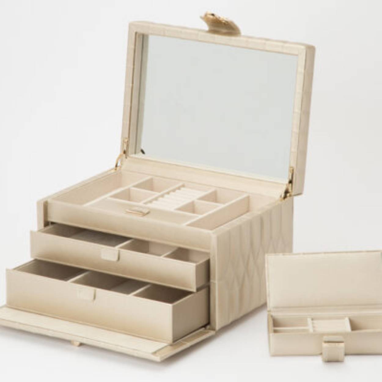 De Caroline Medium Jewelry Case, een tijdloze klassieker met elegante zachte lijnen van de jaren ’50, soepel diamant gewatteerd leer geaccentueerd met gouden hardware. Deze verfijnde etui is het perfecte huis voor uw kostbare sieraden en erfstukken. De case is verkrijgbaar in vier verschillende kleuren en verschillende groottes.