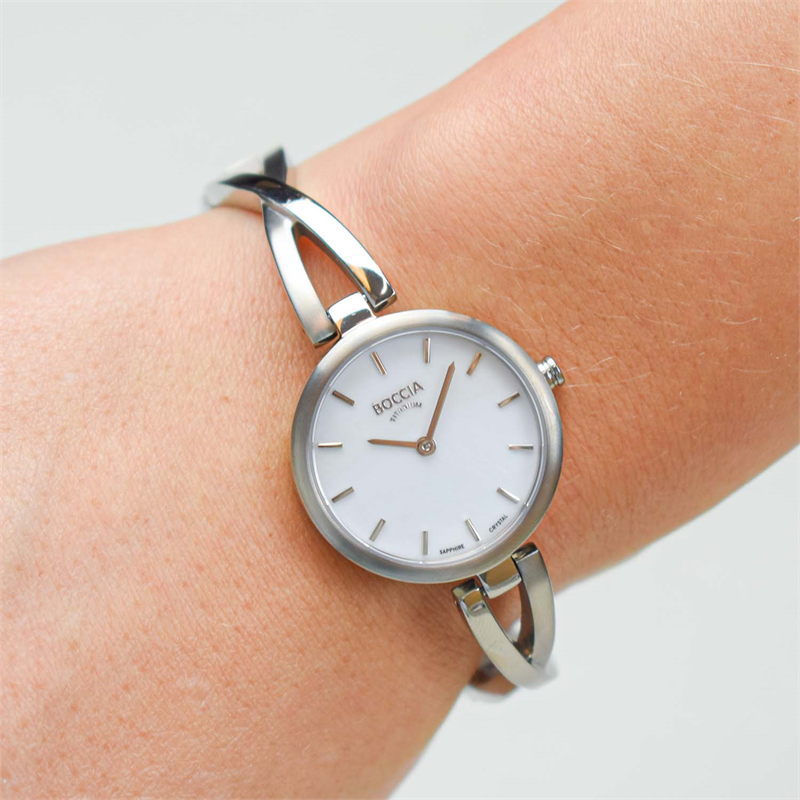 Dit dameshorloge van Boccia Titanium heeft een nette uitstraling. De zilverkleurige horlogekast zorgt voor een stijlvolle look en de parelmoer wijzerplaat maakt het horloge chique. Het horloge heeft een ronde kast met een diameter van 28mm, een saffierglas en is 5ATM. Combineer dit prachtige exemplaar met de andere sieraden van Boccia Titanium voor een complete look. Aan de titanium kast zit een titanium fijne bangle band.
