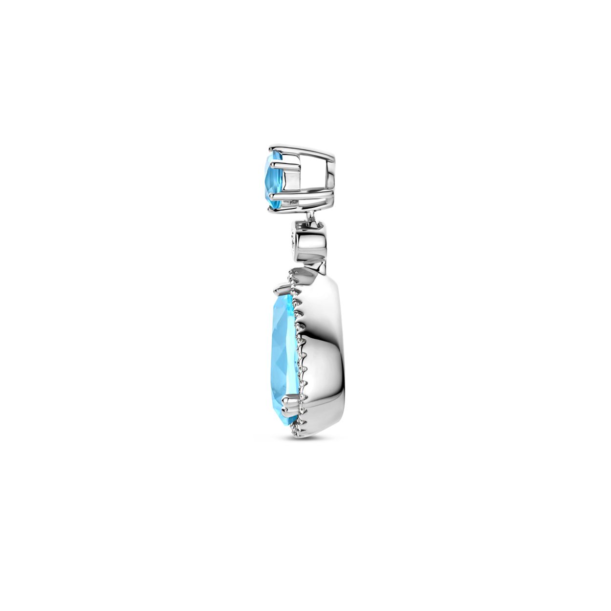 14k Witgouden hanger uitgevoerd met sky blue topaas, london blue topaas en diamant. De hanger heeft een totale hoogte van 25mm. Het diamantgewicht is 0.17ct.