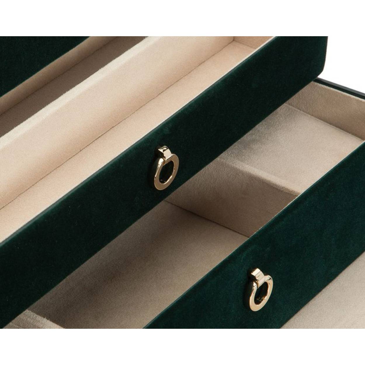 Fresh faced and fun, Zoe is sophisticated but playful. The Medium case’s soft forest green body highly embroidered with classic floral designs is as beautiful as its accessories inside. Includes velvet exterior, LusterLoc™ interior, pale gold hardware, and removable mini travel piece.