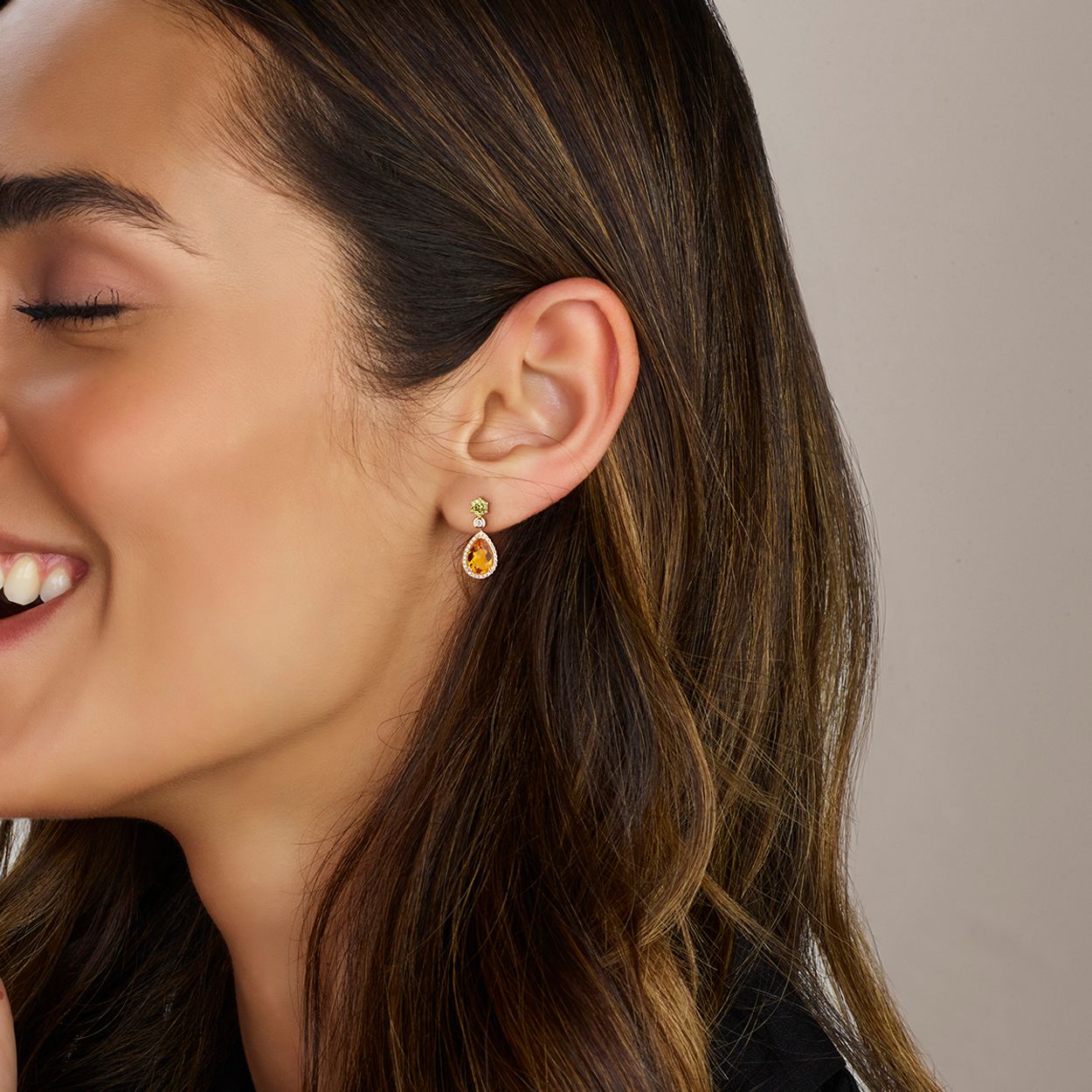 14k Geelgouden oorhangers uitgevoerd met peridot, citrien en diamanten. De oorhangers hebben een totale hoogte van 21mm.