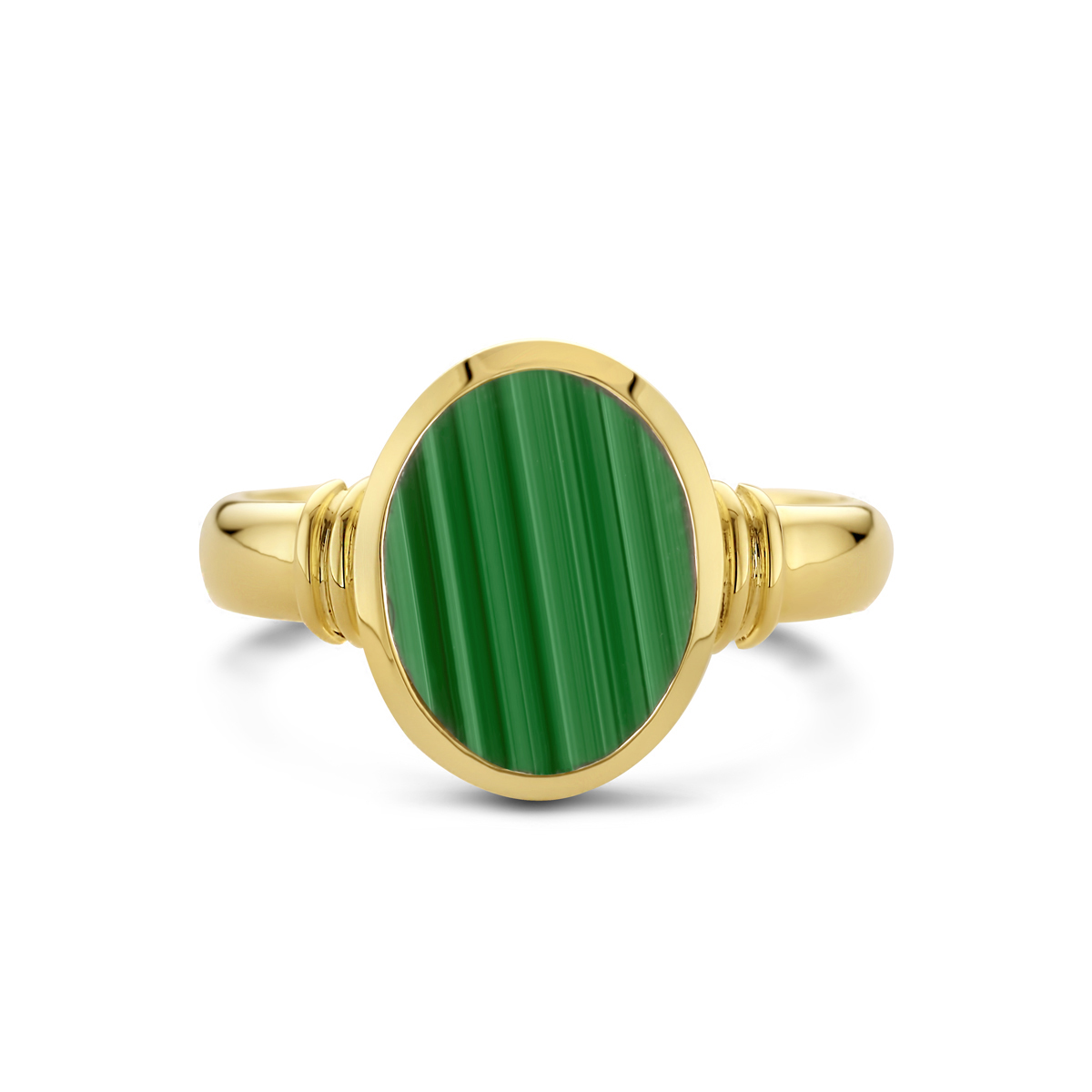 14k Geelgouden ring uitgevoerd met een schitterende malachiet. De ring heeft een afmeting van 12.5x10mm. De malachiet heeft een steengewicht van 2.74ct.